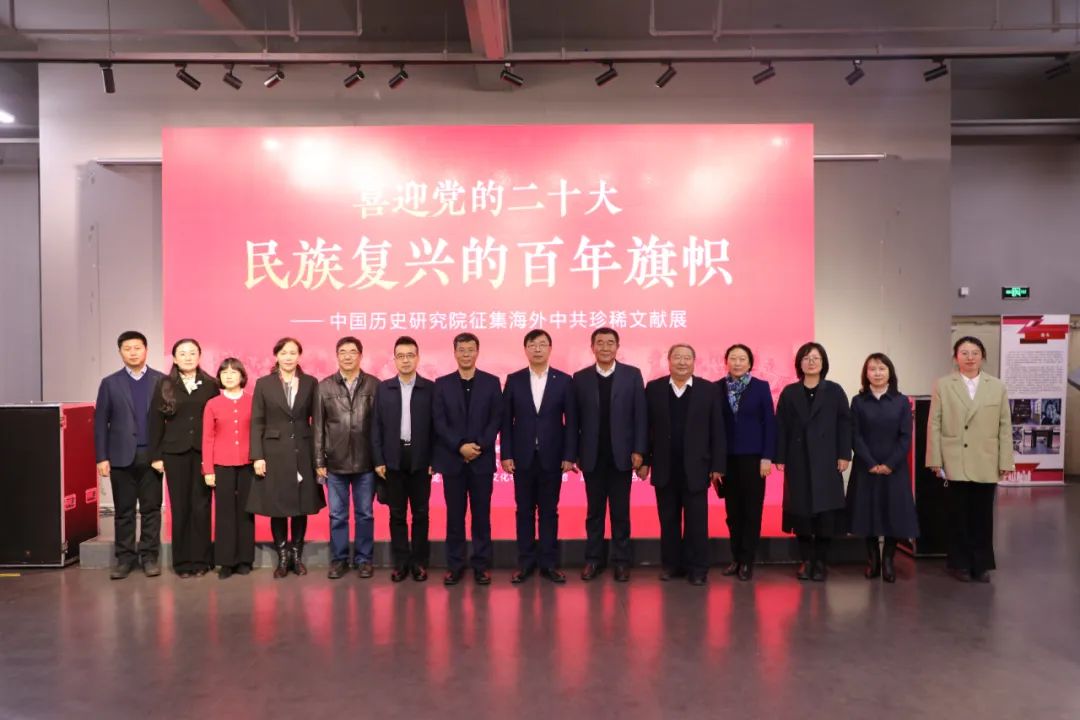 孙立军、李庆霞与郝文斌、刘德权、刘伟、李凤飞、王宏宇等嘉宾共同为“喜迎党的二十大 民族复兴的百年旗帜——中国历史研究院征集海外中共珍稀文献展”揭幕。