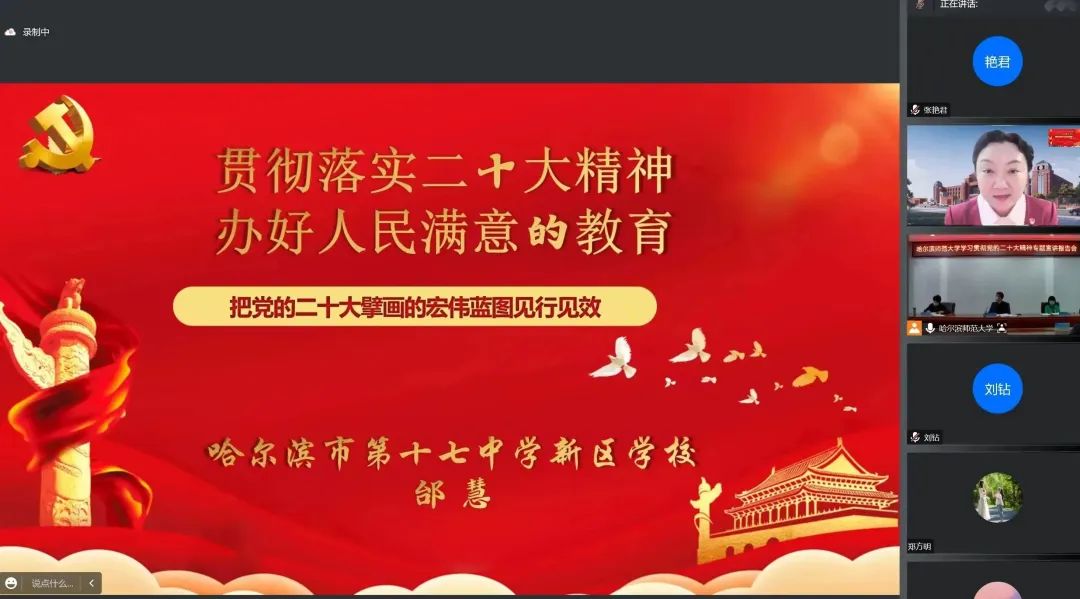 (张柏卓然/文)为深入学习贯彻党的二十大精神,推动学习贯彻走深走实,11月25日上午,我校举办党的二十大精神专题宣讲报告会,党的二十大代表、省教育系统宣讲团成员、全国模范教师、哈尔滨市第十七中学新区学校副校长邰慧作宣讲报告。校党委书记孙立军出席会议并主持。校党委理论学习中心组成员在主会场行知楼915会议室参会,省级重点学科带头人,博士生导师,民主党派、副处级及以上干部、系主任,全体辅导员在线上分会场视频参会。