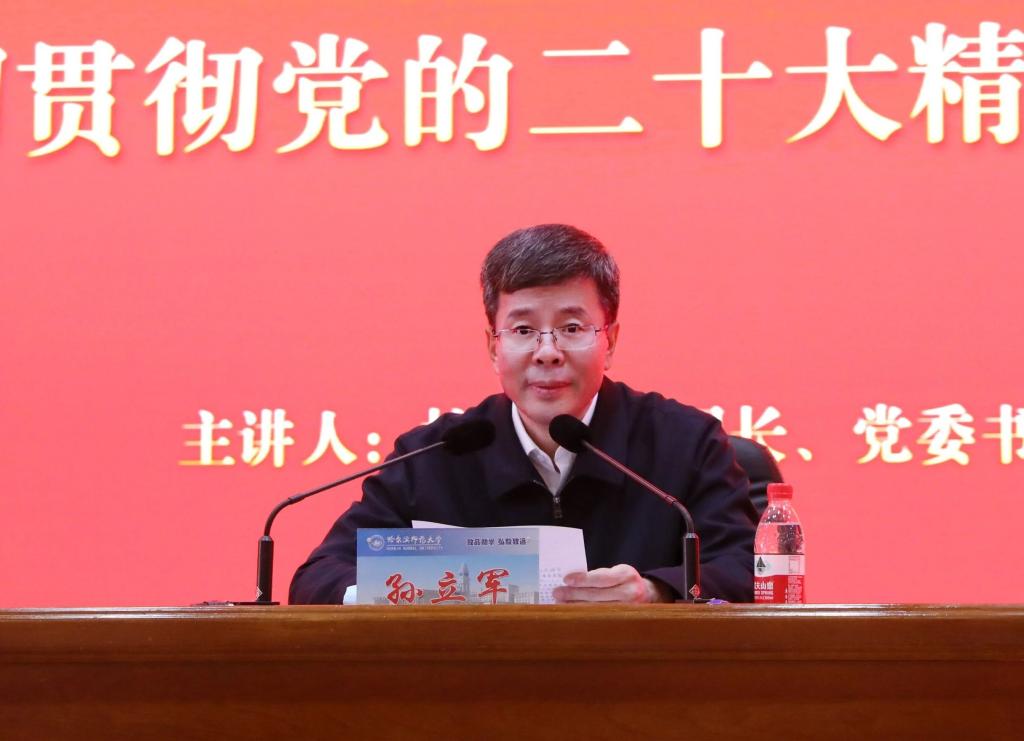 孙立军在报告中表示,学习宣传贯彻党的二十大精神,学习是基础、宣传是手段、贯彻落实是目的,最终要见行动、见成效。要在全面学习上下功夫、在全面把握上下功夫、在全面落实上下功夫,注重学以致用,始终保持昂扬向上、奋发有为的精神状态,始终保持埋头苦干、真抓实干的工作作风,在科学精准做好疫情防控工作的同时,认真开展好各项工作。全校上下要切实将学习成果转化为“为党育人、为国育才”的强大动力,转化为提升办学治校能力和水平的思想源泉,转化为建设“国内一流师范大学”的生动实践,真正把大会精神转化为谋划发展、推动发展的正确思路、扎实举措和实际成效。
