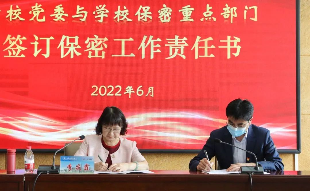 会议传达了上级有关文件精神和工作要求,通报了有关泄密案件情况,部署了学校2022年保密重点工作任务,李庆霞代表学校党委与相关部门负责同志签订了《保密工作责任书》。