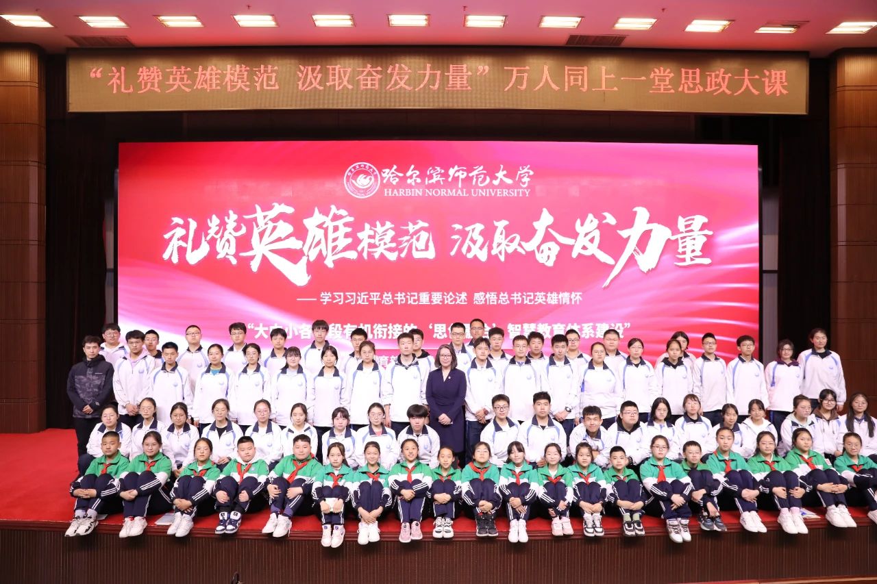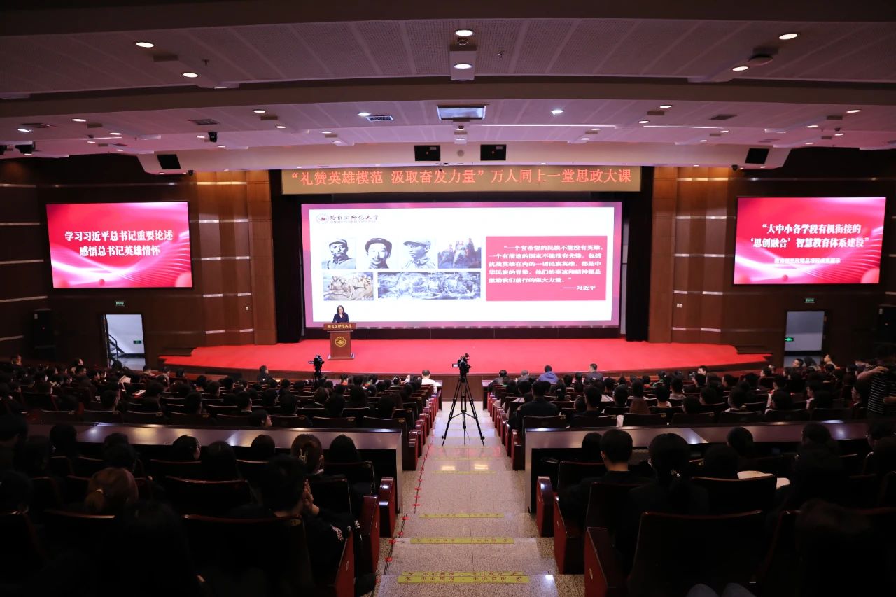 (刘强/文)为深入贯彻党的二十大精神,学习习近平总书记关于崇尚英雄、学习和弘扬英模精神的重要论述,深入推进党史学习教育常态化长效化,全面贯彻中办、国办《关于实施中华优秀传统文化传承发展工程的意见》,落实中央文明办、省文明办关于组织开展传统节日文化活动的工作部署,充分发挥民族传统节日思想熏陶和文化教育功能,进一步探索建设“大中小各学段有机衔接的‘思创融合’智慧教育体系”,引导广大师生在认知传统、尊重传统、热爱传统中弘扬新风,4月4日下午,学校在科学会堂二楼报告厅举办“礼赞英雄模范 汲取奋发力量”万人同上一堂思政大课活动。讲座由校党委副书记、工会主席郭砾主讲,我校各学院师生代表,校、院学生会主席团成员,哈市中小学生代表600余人线下参会,全市大中小学学生万余人线上收看讲座。